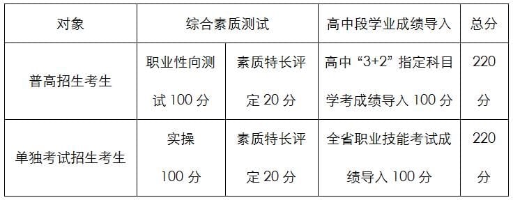 校考实行普高招生考生和单独考试招生考生分类命题、分类评价、分类分专业录取。普高招生考生重点考核职业适应性,单独考试招生考生重点考核专业技能,具体考察科目及权重如下表: